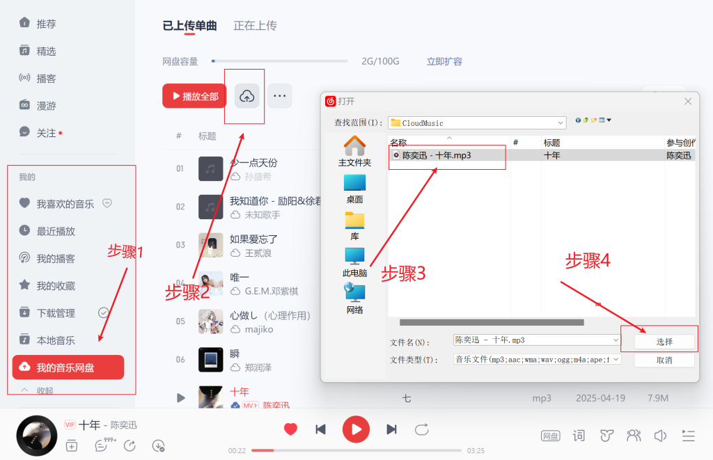 首先打开网易云音乐,在<我的>页面中,找到音乐云盘,点击上传按钮,将歌曲上传就好了